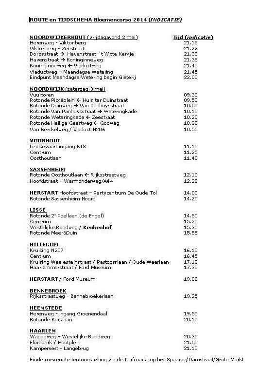 Парад Цветов стартует в Нордвейке в субботу, 3 мая, в 9:30 утра, и финиширует в Гарлеме в 9 часов вечера. Около 3:30 дня Парад Цветов проходит через Кейкенгоф.