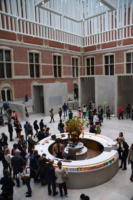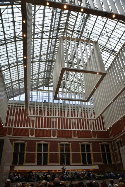 Вот так о нем отзывается путеводитель: «Легкий португальский известняк контрастирует с темной кирпичной кладкой, большие лестницы практически без украшений вяглядят монументально и при этом по-голландски сдержанно. Из впечатляющего атриума посетитель поднимается по исторической лестнице, ведущей в полностью обновленный Voorhal (парадный вестибюль, Зал славы, а оттуда уже во все прочие залы».