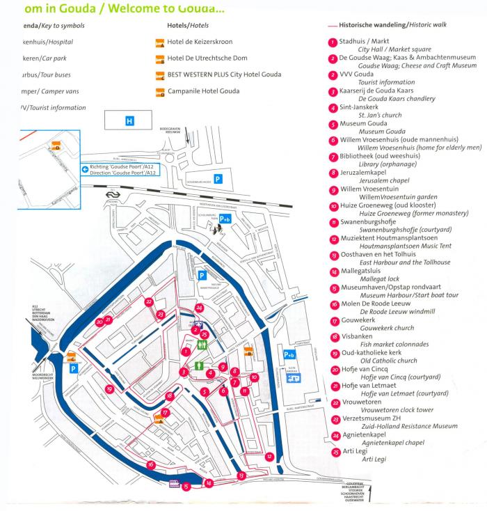 Не случайно в этом городе сыр занимает центральное место в туристической индустрии. Традиционное здание сырной весовой – это наиглавнейшее здание на главной площади. Куда мы и устремились. А теперь предлагаю снова вернуться к схеме центра города. На главной площади явственно отмечен офис туристической информации. Мы обошли площадь три раза, пытаясь его отыскать. Видите количество указателей на столбе перед сырной весовой палатой (справа)?