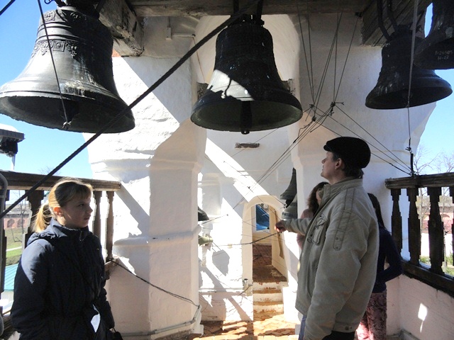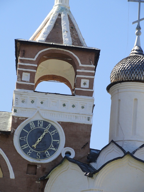 Итак, к 14.30 мы с кумой были у задней двери звонницы.Обратите внимание на Куранты звонницы. Куранты имеют вместо цифр БУКВЫ ( ведь всем известно что цифры появились на Руси только во времена Петра1). Мало того, на Курантах только ЧАСОВАЯ стрелка- не спешили люди в те времена-достаточно было и одной лишь часовой стрелки.Подошедшему звонарю(а именно он и вел экскурсию) я рассказала о мечте наших старших девочек попасть на звонницу. Окинув девчонок взглядом он разрешил под нашу ответственность и им подняться. Почему детям до 14 лет нельзя на Звонницу я так и не поняла. Думаю лет с 10 спокойно можно. Винтовая лестница (крайне узкая- я полная женщина и мне «в плечах» было тесновато))) увела на высоту 3-4 этажа. Далее Александр Леонов (именно так зовут звонаря монастыря) поведал нам и историю возникновения колокольни, впоследствии звонницы, и историю отлива колоколов, и просто историю времен Ивана Грозного. Сама экскурсия длилась 30 минут. За это время мы немного продрогли, но нам было очень интересно. Надо заметить, звонарь — господин с довольно таки изрядной долей корректной ехидности и обладает чувством юмора! Несколько раз он довольно мило «подколол» девчонок и нас нашим непониманием очевидных вещей.Затем был волшебный звон и мы стояли под колоколами наслаждаясь действом. Вы бы видели воочию как «летают» пальцы звонаря по металлическим тросам… Зрелище неописуемое!!!Перед началом звона я досконально выяснила что написано у него в трудовой книжке, не теряет ли он слух, каким образом происходили тренировки, где учился и т.д. и т.п.))))) Дабы прояснить одним махом все, Александр написал адрес своей странички в инете. Делюсь ею с Вами: Читайте-просвещайтесь!
