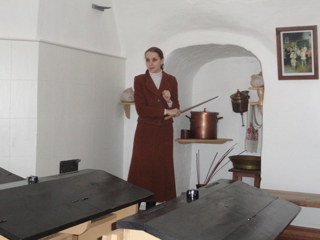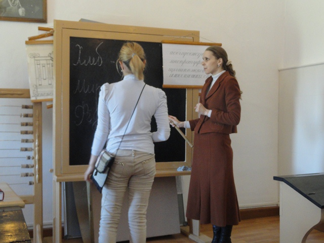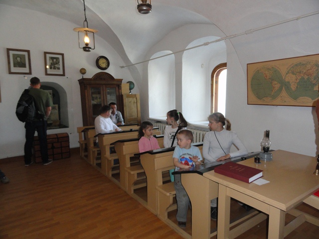 Еще одна никем не афишируемая экскурсия, ну разве что кратенько про неё на оф. сайте написано.При всем при этом КРАЙНЕ познавательная и увлекающая в действо детей, да и что уж тут стесняться, взрослых тоже.))). Проводится в Кремле. Называется «Урок в земской школе». Цель: ознакомить детей со старым алфавитом из 35 букв, научить писать слова с использованием этих букв, показать быт земской школы, научить писать перьевой ручкой. Как я вытребовала эту экскурсию- отдельная история: Заходим мы, значит, в церковь для осмотра и приобретения билетов. Покупаем билеты в Рождественский собор (там Златые врата), ну и заодно интересуюсь у кассира экскурсией.Эта очаровательная дама, еле переплевывая через губу, сообщает мне о том, что данная экскурсия по предварительному согласованию. Хорошо.Прошу её согласовать. Она тыкает пальцем в телефон на окне и предлагает мне это самостоятельно сделать. Хорошо.Интересуюсь номером телефона- дама мне его называет. Звоню. По голосу ответившему на другом конце провода понимаю что все будет чудесно! Очень приятная женщина подошла через 4 минуты и начался наш урок. В процессе нашей экскурсии обалдевшие от везения люди с детками к нам присоединяются. Экскурсия на 8 человек обошлась что-то около 450 рублей. Расселись по местам. Рассказ о том, почему «Однокашники», а не «Одноклассники». Пишет слово «Хлеб» с использованием вышедших из алфавита букв:Сын «отведал Гороховой каши» за плохое поведение( делает вид, а может и вправду больно):