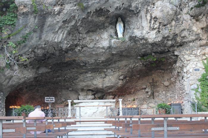 Оказалось, что тут находится некое Святилище. По сути — это большой грот, в котором установлена статуя, очевидно Девы Марии. Очень торжественно. Своего рода храм под открытым небом. Рядом с гротом, во множестве оставлены благодарственные таблички. Их много, они на разных языках и с разного времени. Люди благодарят за помощь, за то, что были услышаны их молитвы. Действительно так — кто-то прозерел, кто-то от недуга излечился, кто-то любовь нашел или счастье.