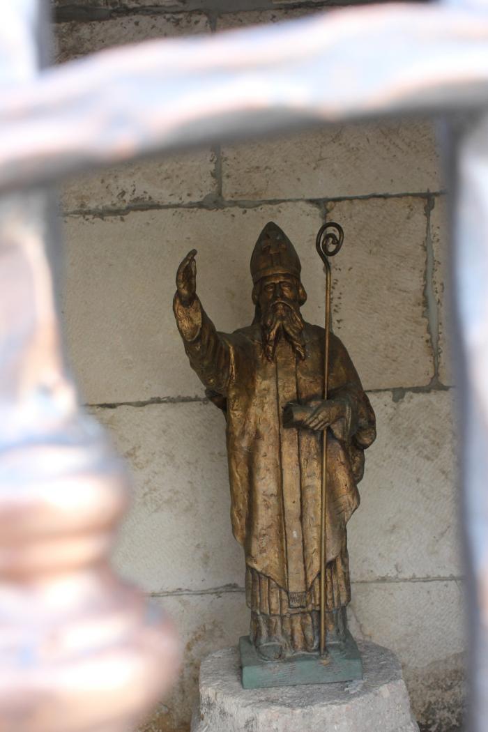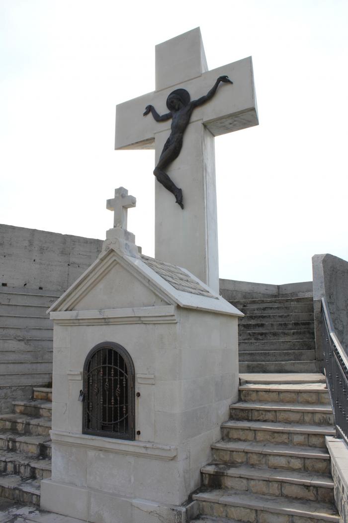 Крутой поворот, справа пропасть метров… дцать, слева скала, верха которой из машины и не видать. И на приступке — памятник. Даже не знаю, как ЭТО назвать. Большой крест, в основании — ниша с решеткой, ступеньки за спиной ведут к каменному «носу», как у Титаника и обрыв. В нише — статуэтка священника.
