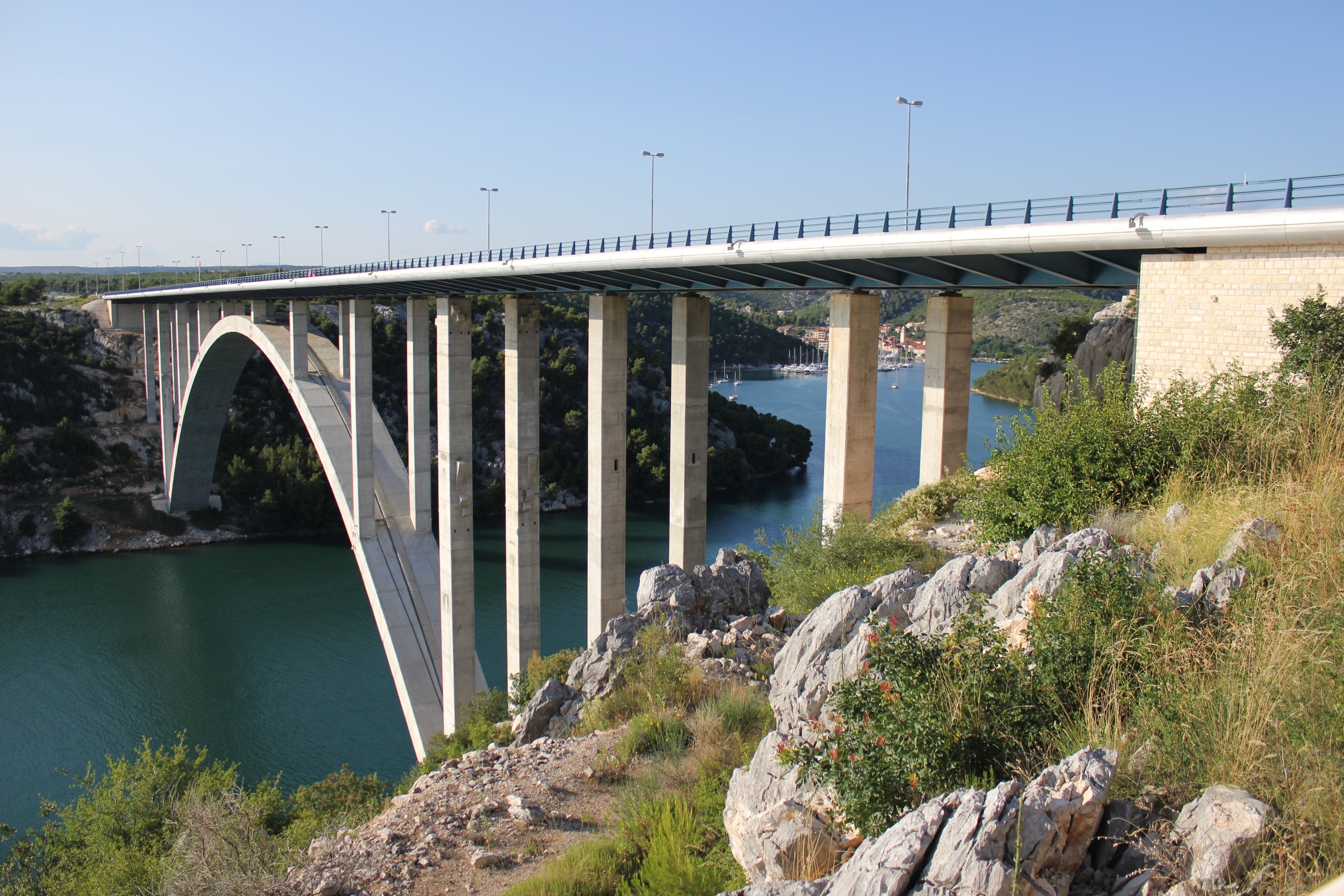 Уже подбирались к морю, преодолев гряду по тоннелям… Дорога шла на юго-восток. Все чаще дети глядели в окно, в надежде разглядеть блеск воды, как внезапно перед нами раскинулся длиннющий и красивый мост через очень даже глубокое ущелье, по которому текла река с названием КРКА.