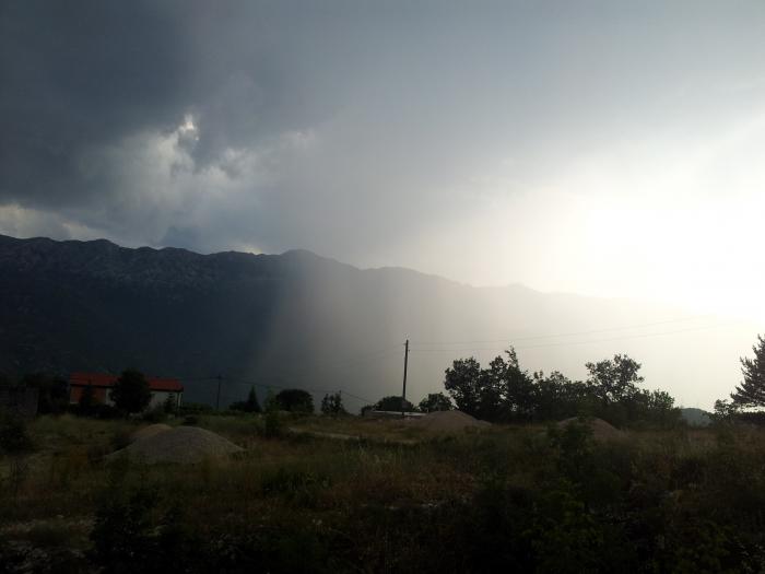 До озера было километров 50, из которых 20 можно было «сделать» по автобану за 100 руб. А можно было его пересечь по мосту и ехать местными дорожками. Это было гораздо «спортивнее». И по закону подлости, как только мы порядочно удалились вглубь, наc «внезапно» настигла гроза. О буйстве грозы в горах, я думаю, слышал каждый. Оказаться на высоте почти километр недалеко от Боснии, в окружении бушующей природы, в машине со всей семьей, мне показалось чрезмерным экстримом. И темнота как-то навалилась, и ветер, и начало хлестать. А слева какие-то развалины, справа, без ограждений, пропасть – я даже не видел ЧТО там, с водительского места. И просто счастье, что именно в том месте оказались. Дело в том, что по правому борту действительно была пропасть. Но на повезло выехать не небольшую площадку. А на другой стороне котловины громоздились еще более высокие горы. И гроза видимо попала в эту ловушку, лишь самым краем зацепив нас – туча «застряла» над пропастью, почти на одном уровне с нами. Так мы и объезжали пропасть, в которой стояла гроза и «жила своей жизнью», и была хорошо видна граница ливня, который изливался, слава Богу, не на нас. Это было запоминающее зрелище. Первое из предстоящих.