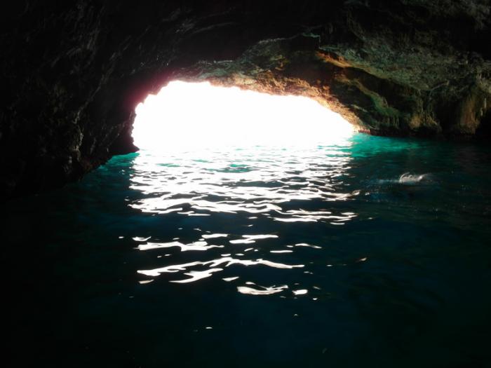 Дальше катера въезжают прямо в грот с бирюзовой водой, подсвеченной только солнечным светом, проникающим снаружи.