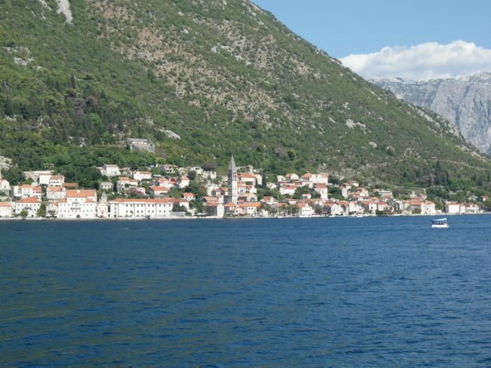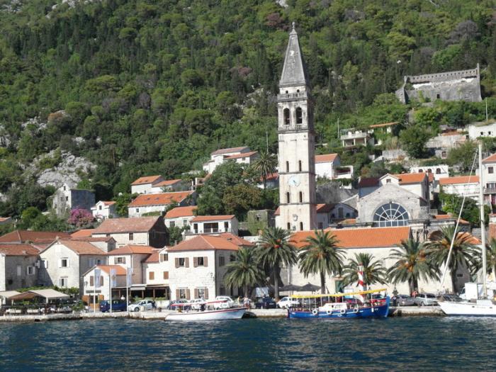 Напротив островов на берегу расположен старый город Пераст с красными черепичными крышами и высокой колокольней – вид просто открыточный…
