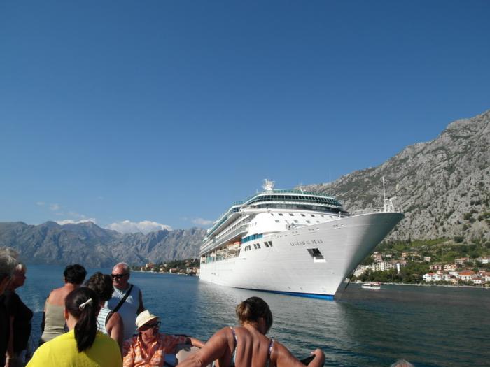 А теплоход, тем временем, плывет к конечному пункту сегодняшнего путешествия – городу Котор, расположенному в самой глубине бухты, где и причаливает рядом с большими круизными лайнерами.