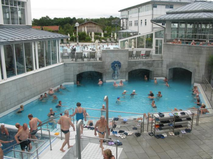 Входной билет на 5 часов +20 минут на одевание -12,50евро.Если берете сразу 10 билетов -11,50.Во всех бассейнах термальная вода, разной насыщенности, в большинстве можно с детьми, но в газовом бассейне (газ-бад), это аналог сероводородной ванны в наших санаториях, вход детей запрещен, но и взрослым рекомендовано там находится 15 мин 1-2 раза/день.Бассейны есть в уличной части и под крышей, много бассейнов с подводным массажем, стой там хоть целый день.Температура воды от 27 до 40 градусов.Раз в час на 20 минут включается скоростной канал, получается что-то вроде быстрой ходьбы, бега в воде, после двухнедельного, ежедневного хождения в нем, икры ног становятся как камень, ноги закачиваются как в хорошем тренажерном зале!)