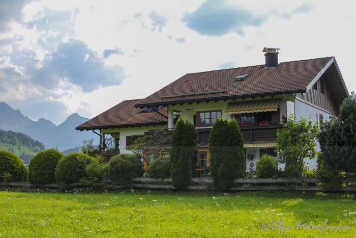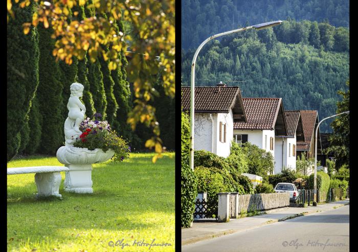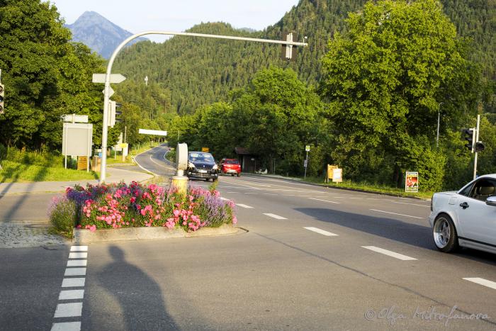 Вот бы стать коровкой, чтоб ходить по таким зеленым свежескошенным лугам, вот бы стать бабочкой, чтобы порхать над этими великолепными цветами, вот бы стать кошкой, чтобы раскинуться на лавочке среди всего этого изобилия растительности. Но как хорошо просто находиться здесь, просто ощущать себя в этом спокойствии! Даже не верилось, что мы находимся в Фюссене.