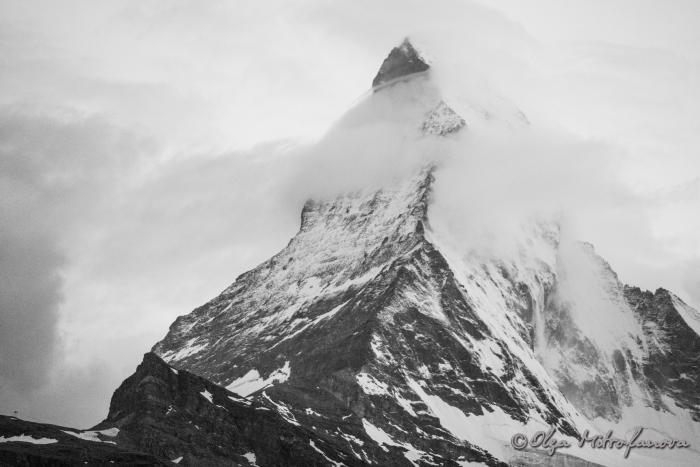 Местами проглядывало голубое небо и, наконец, мы увидели частичку Маттерхорна. Вот он какой величавый! Огромный-преогромный!