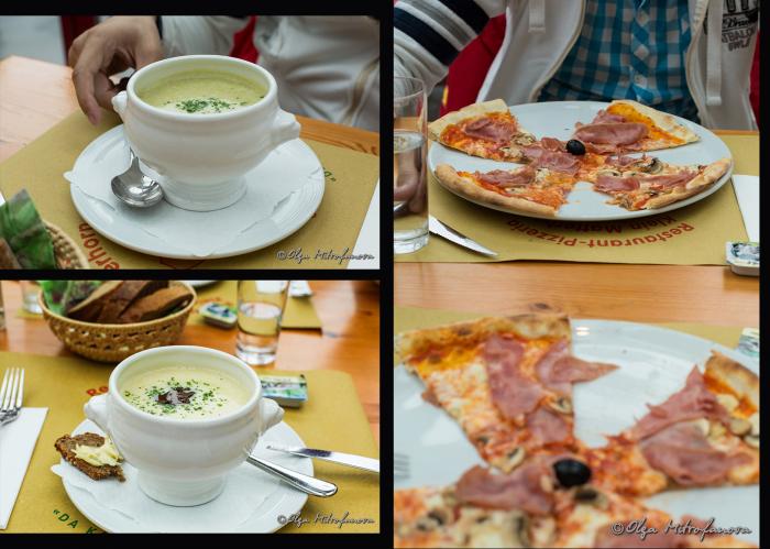 А нашли мы его прямо у станции подъемника, ведущего на Glacier Paradise. В кафе никого не было. Но нас приняли и очень вкусно накормили горячими супами и пиццей. Вот горячий суп в такую прохладную и сырую погоду оказался очень кстати.