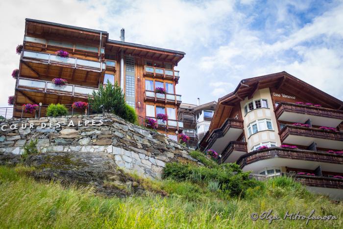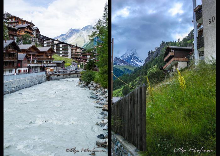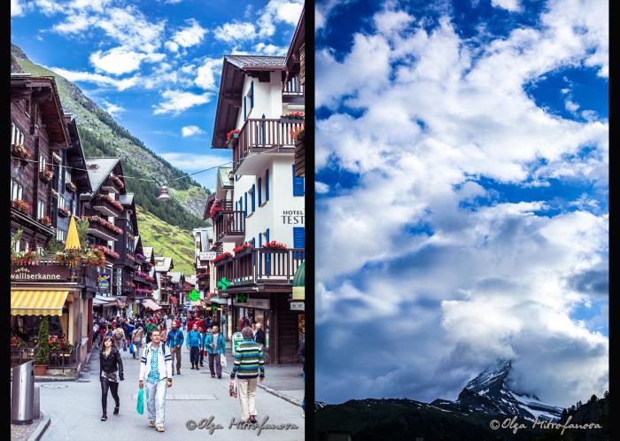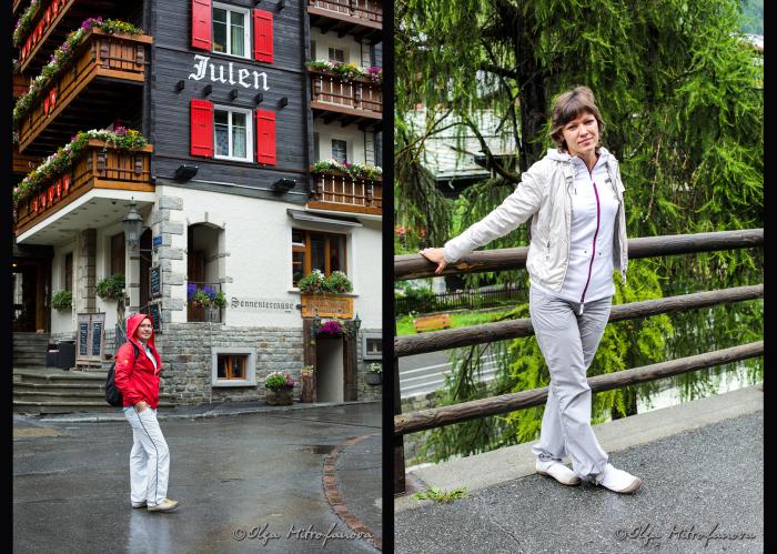 Но в такую густую облачность даже его частички не было видно. Мне даже на мгновение показалось, что все фотографии этого пика в интернете сделаны совсем в другом месте, а никак не в Церматте. Но через часик, пока мы сушились, дождь прекратился, тучи стали расходиться в разные стороны. Администратор отеля заверил, что завтра будет хорошая погода. Но это завтра, а сегодня не хотелось проводить полдня в отеле и мы, одевшись, пошли гулять и искать обед.