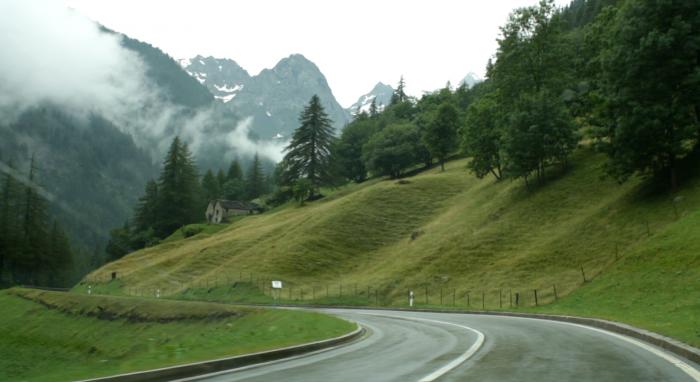 Дальше дорога пошла с нормальной скоростью. Через некоторое время мы снова пересекли границу Швейцарии, которая возникла буквально среди гор. О ее приближении нам говорило только большое скопление машин по обе стороны дороги на специальных стоянках и два домика с швейцарскими флагами. Выполнив требование знака «стоп», в будке нам махнули, чтобы мы ехали дальше.