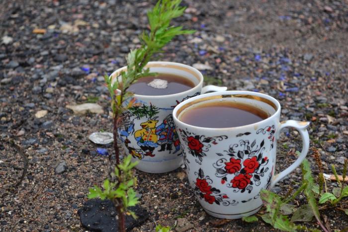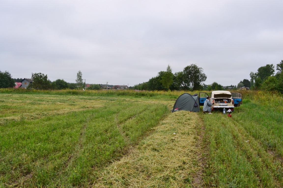 Границу прошли за часа два-три. На ночевку остановились за Витебском. Палатку в темноте, в полевых условиях поставили довольно быстро(дома один раз тренировались ставить). Ночью моросил дождь, но спать в палатке довольно комфортно. Утром я вставал первым, ставил чай(чай пили из душевных чашек для чая), потом просыпался Макс.