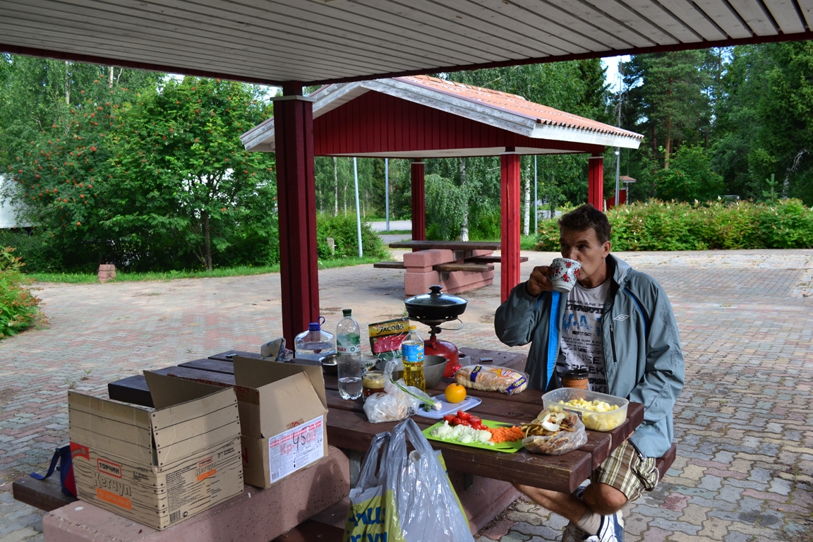 На стоянке решили попить кофе с молоком и с нашими родным совдеповскими печеньями. Это большое удовольствие. Неподалеку стояла финская компания, одна женщина и двое мужчин. Они были на микроавтобусе и катер на прицепе.
