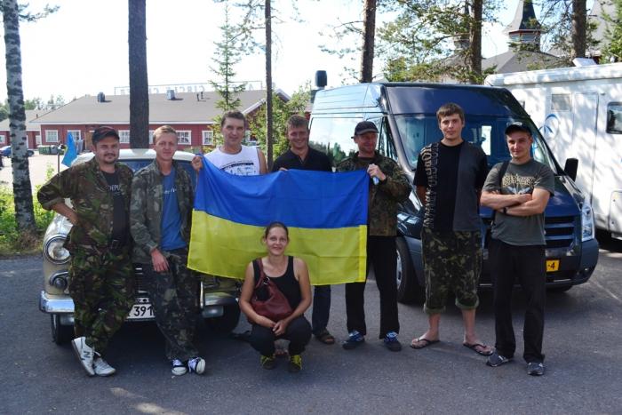 Сегодня было запланировано посетить деревню Санта Клауса. Она находится на сопке Корватунтури, около города Рованиеми. Честно говоря мы думали, что в июле Санта не работает. Чуть было не проехали. Но увидели большое скопление машин, людей, бетонную стелу Полярного круга над трассой, повернули на стоянку(бесплатную). Как только вышли из машины, мы услышали крики. Посмотрели, нам машут руками. Оказались земляки из Западной Украины. Подошли, пообщались, обменялись впечатлениями. Очень удивились нашем авантюрному путешествию. Решили сфоткаться на память. Ребята пожалели, что нет флага Украины. А мы им сказали, что нас есть (мы доже загордились тем, что мы, ребята из Крыма не забыли взять флаг Украины).