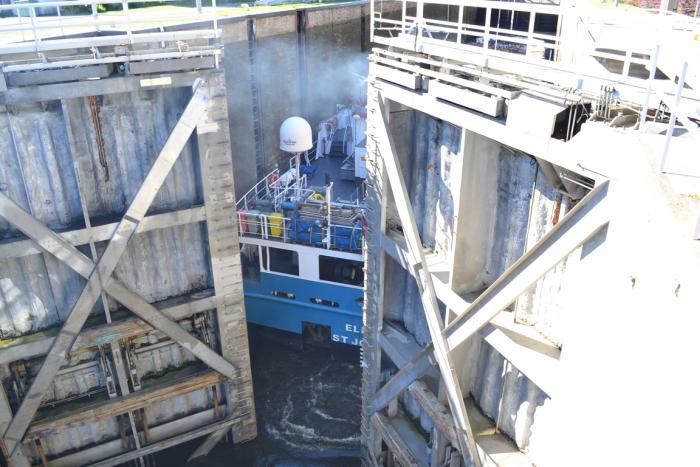 Перед самой границей пошли красивейшие места. длинные, узкие нескончаемые озера, сосны. Но пограничный контроль непонятно — строжайший. Перед самой границей два раза остановили, проверили документы. Остановились перед шлюзом, пропускали баржу с песком. Макс пошел фотографировать шлюз. Выбежала тетя сержант с пистолетом, чуть фотоаппарат не отобрала, приказала фотографии удалить. Секретный стратегический объект.