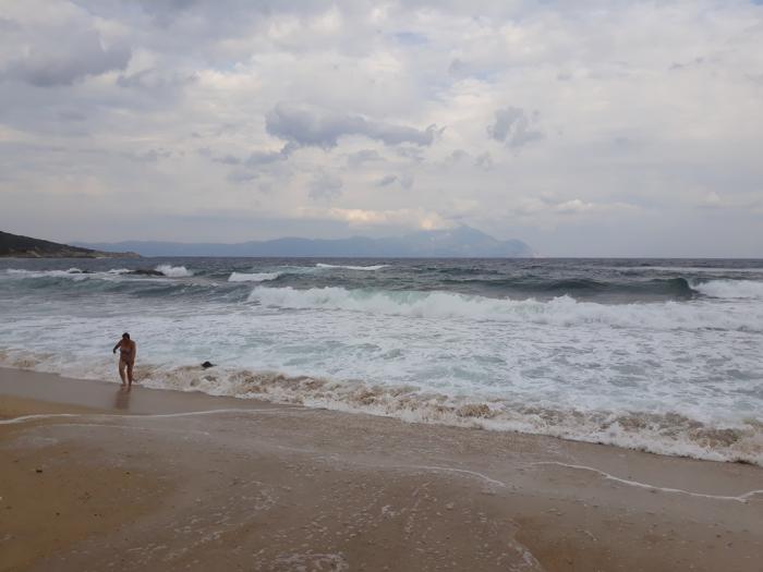 Или, в последний перед отъездом день выходим на пляж в Сарти, а там совсем не Эгейское море, а скорее Баренцево или море Лаптевых.
