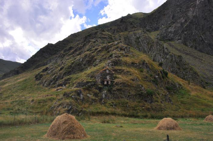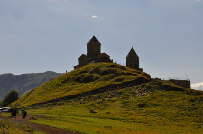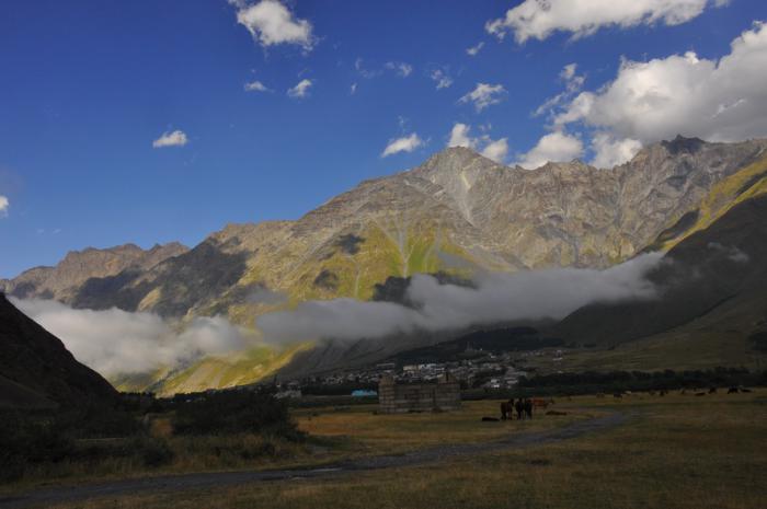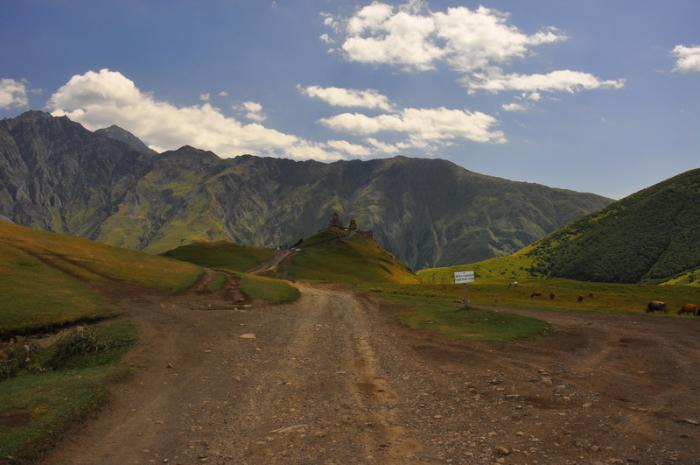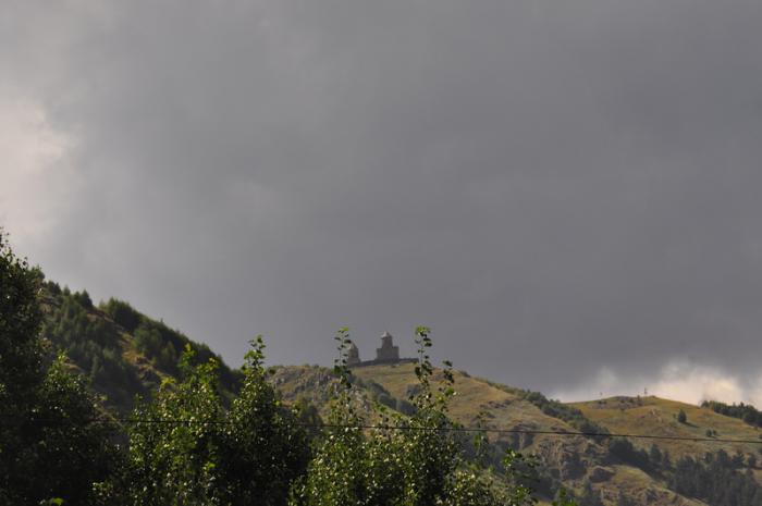 Последняя наша стоянка на территории Грузии. Размещаемся в . Расположение – 10 минут ходьбы от центра Степанцминды, по сути, это уже село Гергети, самое начало подъема к храму Святой Троицы и далее к вершине Казбека. В гестхаусе чисто, уютно, а окружающие виды с лихвой компенсируют мелкие недостатки. Хозяин – Лео, ориентирует нас в местных достопримечательностях и рассказывает, как лучше до них добраться. На осмотр у нас один день, цель №1 – церковь Святой Троицы, вот она, вдали на горе,