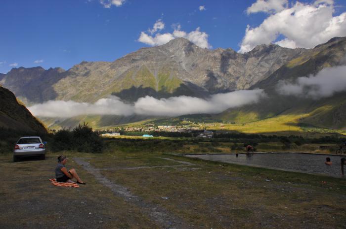 Остаток вечера посвящаем ужину, прогулке по Степанцминде и раздумьям, как добираться до церкви – пешком или на такси. Подъем на своей машине исключен, дорога там только для хорошего «проходимца» типа «Нивы» или Mitsubishi Delica, кои очень популярны среди грузинских таксистов в этих краях. Пока гуляли и ужинали, поняли, что Степанцминда одно из самых дорогих мест в Грузии. Причин несколько – близость границы (очень удобно остановится до или после многочасового стояния), отсюда начинаются восхождения на Казбек и, как следствие, большое количество богатеньких буратин из дальнего зарубежья.