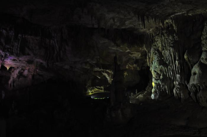 Проехав еще километров пятнадцать, попадаем на окраину города Цкалтубо, где находится пещера Кумистави, ныне, после благоустройства, более известная как Пещера Прометея. Вот тут чувствуется вся грандиозность подземного мира! Природная красота, умело оформленная человеком и при этом совсем не испорченная, впечатляет. Фотографировать со вспышкой нельзя, да и вспышка все только портит. Штатив благополучно забыт в Москве, а если бы и был, то на его установку нет времени. В общем, фотографировать приходится с рук, что вышло – то вышло.