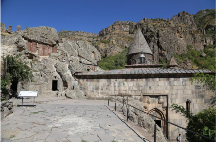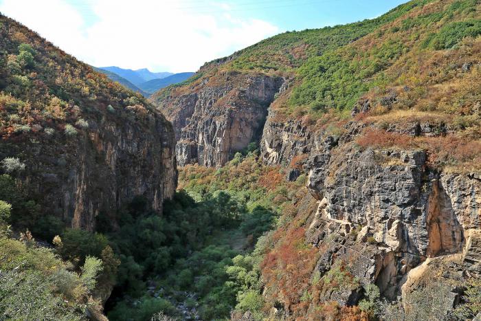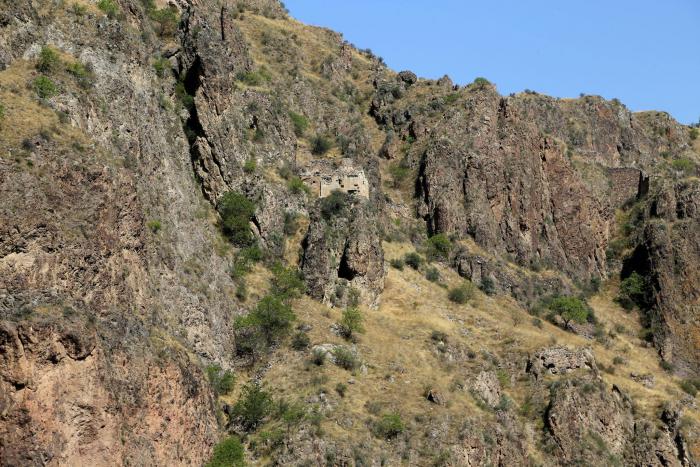 Не заезжая в Ереван, сворачиваем к монастырю Гегард. Ущелье ведущее к Гегарду впечатляет грозными утёсами и пещерами в отвесных скалах.