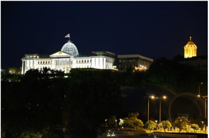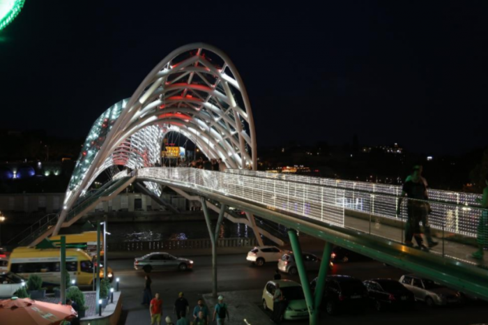Высоко возвышается над левым берегом дворец президента Грузии и Цминда Самеба. Оба строения великолепно смотрятся ночью. Вообще в Грузии ночной подсветке уделено много внимания и даже малозначимые и удаленные объекты по всей стране обычно имеют ночную подсветку.