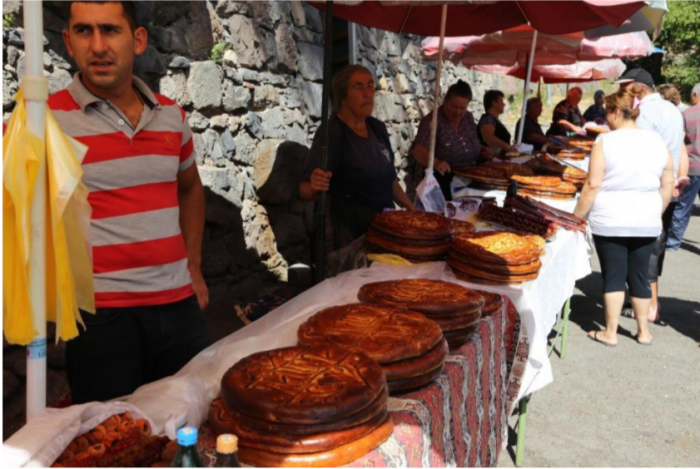 Перед монастырем торгуют армянским вариантом чурчхелы, он почти вдвое больше грузинской. Вязкость оболочки не такая пластмассовая, нежнее. Торгуют и большими сдобными хлебами с орехами.