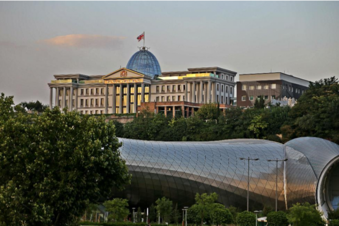Повторюсь это всё вокруг президентского дворца. Впрочем, чтобы картинку не портить сзади дворца натянут огромный баннер метров в десять высотой и наверное в сто длинной, который как бы ограждает гостей дворца от возможности увидеть такой Тбилиси.