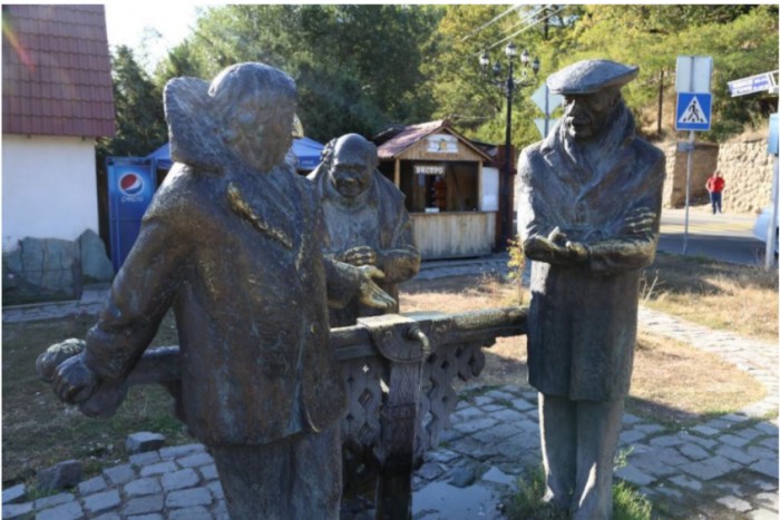 Памятник героям *Мимино* с ключом родниковой воды стоит прямо на развилке основных дорог, идущих через город.