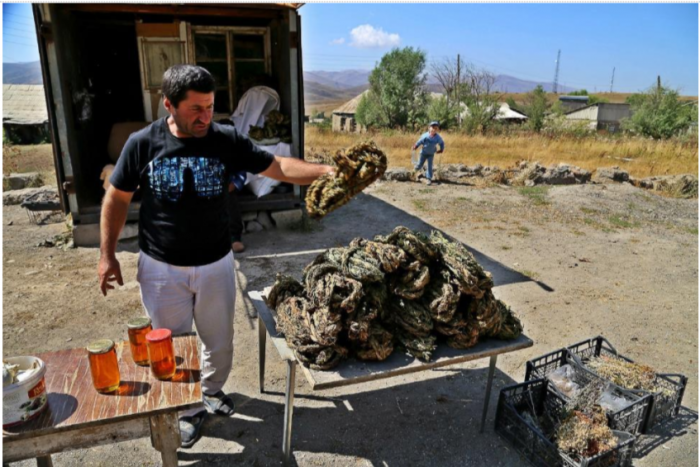 В деревнях возле дороги торгуют конским щавелём. Сушенный косичками в кольцах. По 700 драм. На вкус как жаренные грибы, из него делают классные салаты.