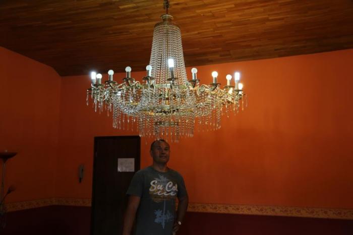В номере набор приколов продолжился. У хозяина, наверное, остался лишним паркет после ремонта, по этому им попросту оббили… потолок. И ещё наверное по случаю он где-то разжился огромной люстрой, потому что, ну, никак нельзя объяснить наличие в номере люстры, занимающей почти всё пространство в комнате.