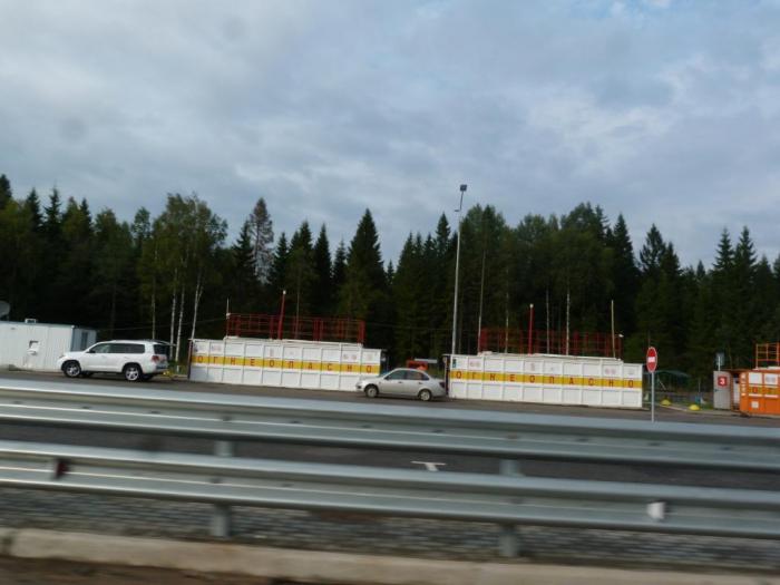 Одна эта попытка заправиться украла у нас около 40 минут, из-за сложностей железнодорожного переезда. В 13:10 мы снова на шоссе, а еще через полчаса съезжаем на наш первый участок М11. Решаем, что надо хотя бы самим «заправиться». Благо, остановки для отдыха на новой трассе пока еще в очень приличном состоянии. Столы, туалеты — всё, как полагается.