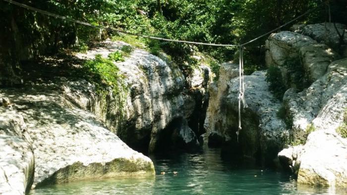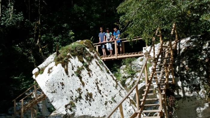 Парк (стоивший нам 850 руб. на четверых) начинается со смотровой площадки, дающей представление о размахе и глубине Навалищенского ущелья, куда нам предстояло спуститься. Оттуда еще прыгают и по канату катаются, но это развлечения на любителя.