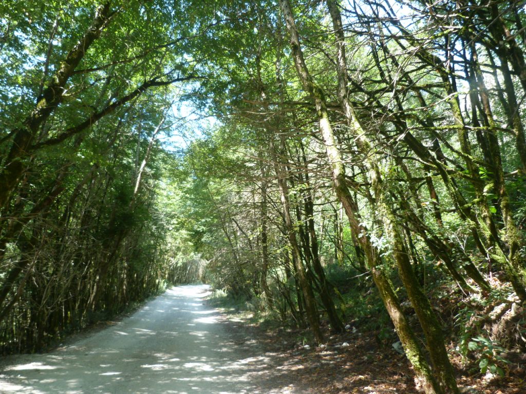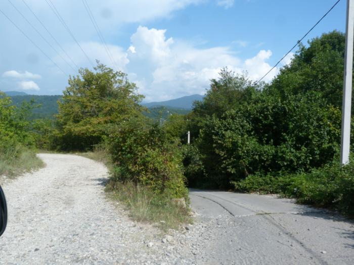 Уже на первой развилке мне приходится выбирать между чуть более пологим, но в хлам разбитым трактом и бетонированным, но крутым пике.