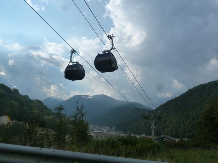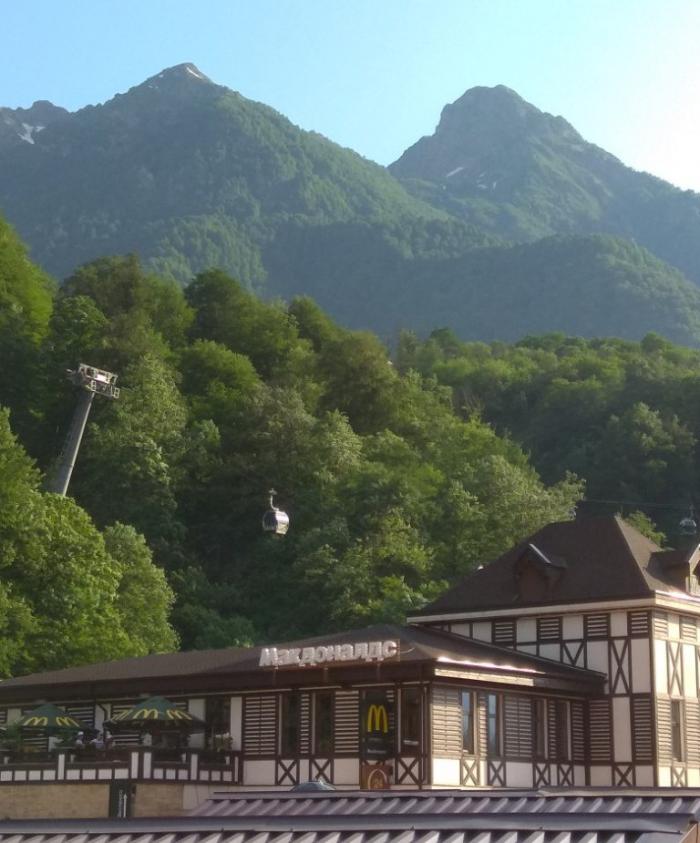 Сама Красная Поляна могла впечатлить меня разве что контрастом между колхидскими лесами на окрестных холмах и победным торжеством Макдональдса в центре города. Но когда мы туда приехали, выяснилось, что та канатка, на которую рассчитывали организаторы, закрыта на техобслуживание. А работает лишь одна, ведущая (с пересадкой) на самую вершину, к Роза-хутор.