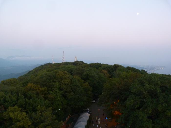 Постояли в 10-минутной пробке возле Олимпийского парка. Свернули на крутую серпантинистую дорожку вверх и в 19:10 встали на парковке. Короткая прогулка, и вот уже она, смотровая башня Большой Ахун.