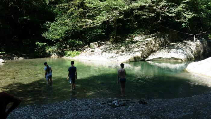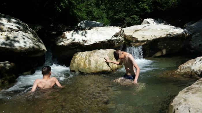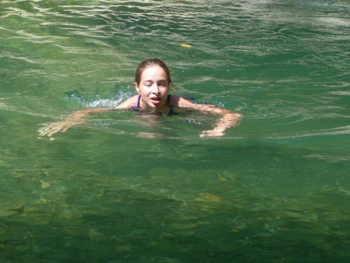Лию не сразу удается уговорить искупаться в горной реке. Дружными рассказами о том, как тут хорошо, мужчины нашей семьи коварно заманивают юную красавицу в бездну. Бодро прыгнув в глубокую воду, Лия издаёт душераздирающий вопль и разражается цензурными, но неделикатными комментариями по поводу наших умственных способностей. :) Впрочем, потом её уже из воды не вытащить.