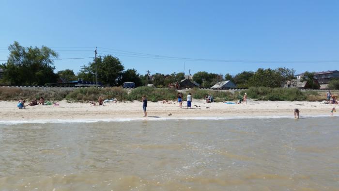 Очевидным минусом этого побережья является железная дорога, через которую надо перебираться, чтобы дойти до воды. Зато на пляже народу в разы меньше, чем там, где мы были. Ну а сама вода… обычная для Азовского моря мутная, но якобы целебная взвесь.