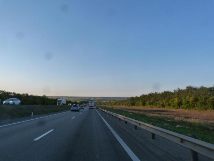 В 18:50 в районе Богучар съезжаем в поля, в объезд. Навигатор показал, что путь по федеральной трассе мимо Верхнего Мамона отнимет у нас дополнительных 2 часа 40 минут! Поворачиваем по указателю на Русскую Журавку. Скорость удается держать приличную, за 24 минуты проезжаем 32 км и поворачиваем на Калач-Павловск. Это шоссе, но дорога на 4-, гребни. Впрочем, 22 км до трассы отнимают у нас лишь 15 минут.