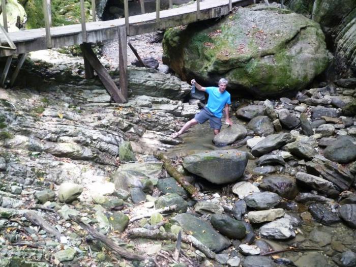 К Свирскому ущелью нас пускают бесплатно, уж не помню: по многодетности ли или у них вообще такая политика? В благодарность покупаем распечатанную схему за 10 руб. Она, в общем, не слишком нужна: заблудиться там практически негде. Хорошо обустроенная дорожка ведет нас то по одну, то по другую сторону ручья, а нередко и вовсе — над ним.
