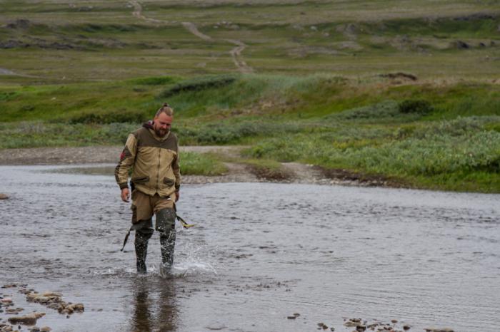 Уходим средней дорогой Рыбачьего, постепенно поднимаясь в сопки, позднее лето преподнесло нам дополнительную задачу – вода. Я читал ранее отчеты, как люди брали Рыбачий в июне, и сколько сюрпризов преподнесла вода, сейчас мы столкнулись с ней сами, вдвоём. Ручьи превратились в реки, лужи в озёра. Я проходил по воде километры в забродных сапогах, выискивая траектории, потом мы с замиранием сердца меняли стихию, и отсчитывая метры: правее, правее, правее, у куста по центру, еще метров сто по центру, резко влево, левее, левее, резко вправо.