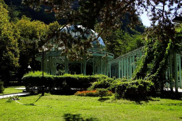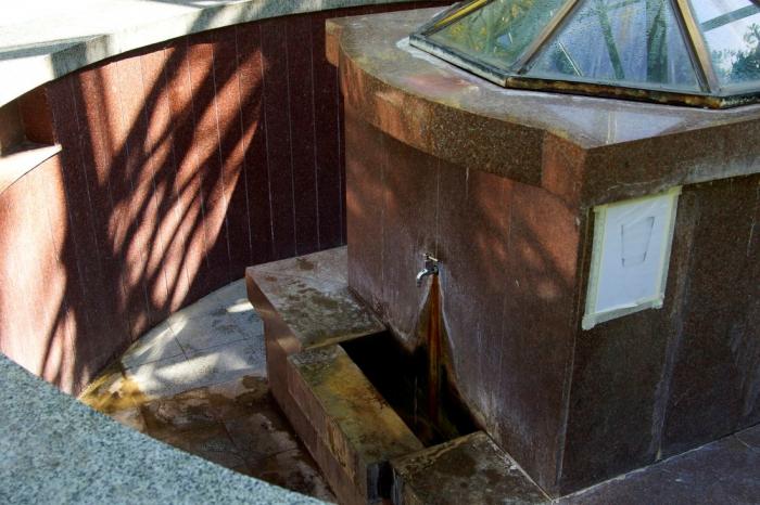 Дошли до источника с минеральной водой. Я думал, там несколько видов воды, а оказалось, что источник всего один. Еле живой струйкой бежит из крана знаменитая на весь Советский Союз минералка «Боржоми».