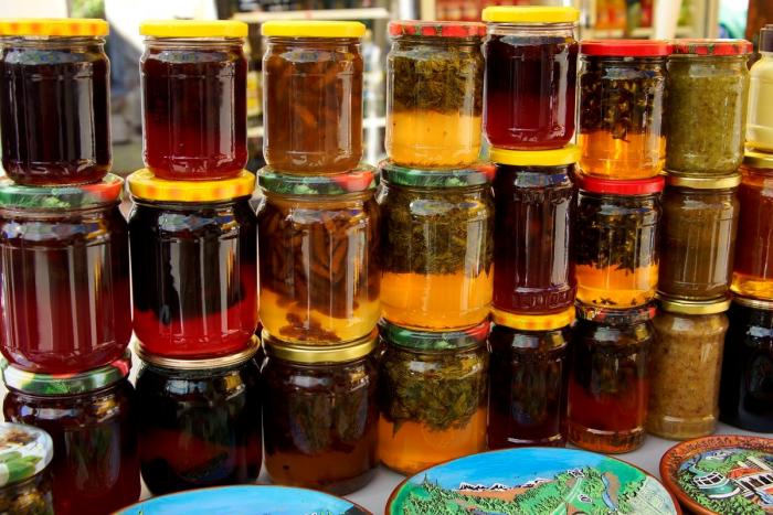 Купили у грузинской бабушки экзотического варенья из молодых можжевеловых шишек размером с напёрсток (шишки мягкие, их можно есть) и ещё из каких-то непонятных совсем уж мелких шишечек или почек. Вкус весьма своеобразный, смоляной.