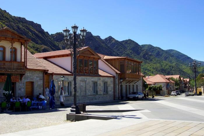 На этой трассе попадаются деревеньки, торгующие каким-нибудь одним товаром. У нас сложилось впечатление, что все деревни Грузии каким-то образом договорились между собой поделить сферы придорожной торговли. Так, например, на этом участке очень часто встречаются точки с глиняными поделками – посуда, горшки, рога для вина, национальные барабаны и пр. В других деревнях у обочин продают различные виды хлеба, в третьих – чурчхелу, в четвёртых – арбузы и дыни, в пятых – кейсы с минералкой, а в одном месте мы проезжали населённый пункт, целиком торгующий автомобильными маслами! Удивительное разделение деятельности.