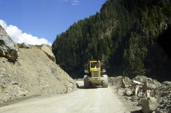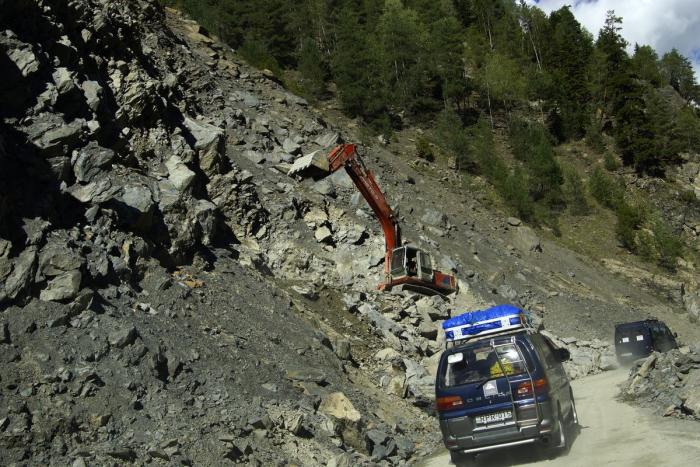 Через 20 минут и правда разрешили проехать, так что мы смогли оценить масштаб разрушений. Обвал оказался длиной метров 100, не меньше. Дорожники с 2-х сторон пробили в нём узкий коридор, сваливая породу в ущелье, где протекает мелкая речка, и периодически пропуская машины сверху или снизу, а в остальное время полностью перекрывали проезд, чтобы без помех вести восстановительные работы.
