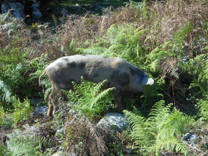 Наружная часть озера, где мы высадились из лодок, находится в некотором отдалении от туристического офиса с парковкой, и большинство продуманных туристов здесь уже ждали такси или родственники/знакомые на машинах. А мы прошлись 15 минут в гору, покормили свободно пасущихся поросят, встретившихся по пути, тут же растущей хурмой. Хурма снаружи зелёная, а внутри – коричневая и спелая.
