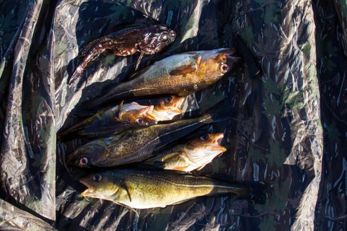 Ловля трески занятие, безусловно, азартное, рыба хитра в меру, лопухом сидеть нельзя, сама в лодку не прыгнет, но и мусолить наживку по полчаса, как, например, подлещик не будет. Ждешь уверенного кивка удилища и не тормозишь, ну а дальше дело техники, подтянул – подмотал, и так по кругу. Остановился я достаточно легко, шесть тресочек за час, на обед, очень даже ничего, с картошечкой, так и вообще. И ещё устрашающего вида бычок, которых здесь не едят.