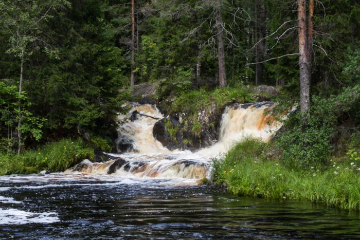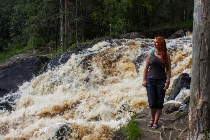Починились и побежали догонять упущенное время, на водопаде Ахинкоски догнали Александра и, наконец-то, познакомились лично, а заодно и с очаровательной Юлией и моим юным тезкой – Антоном. Семейство такое в Джимника не влезает, поэтому узнал я Александра по правильному мостовому Патролу.
